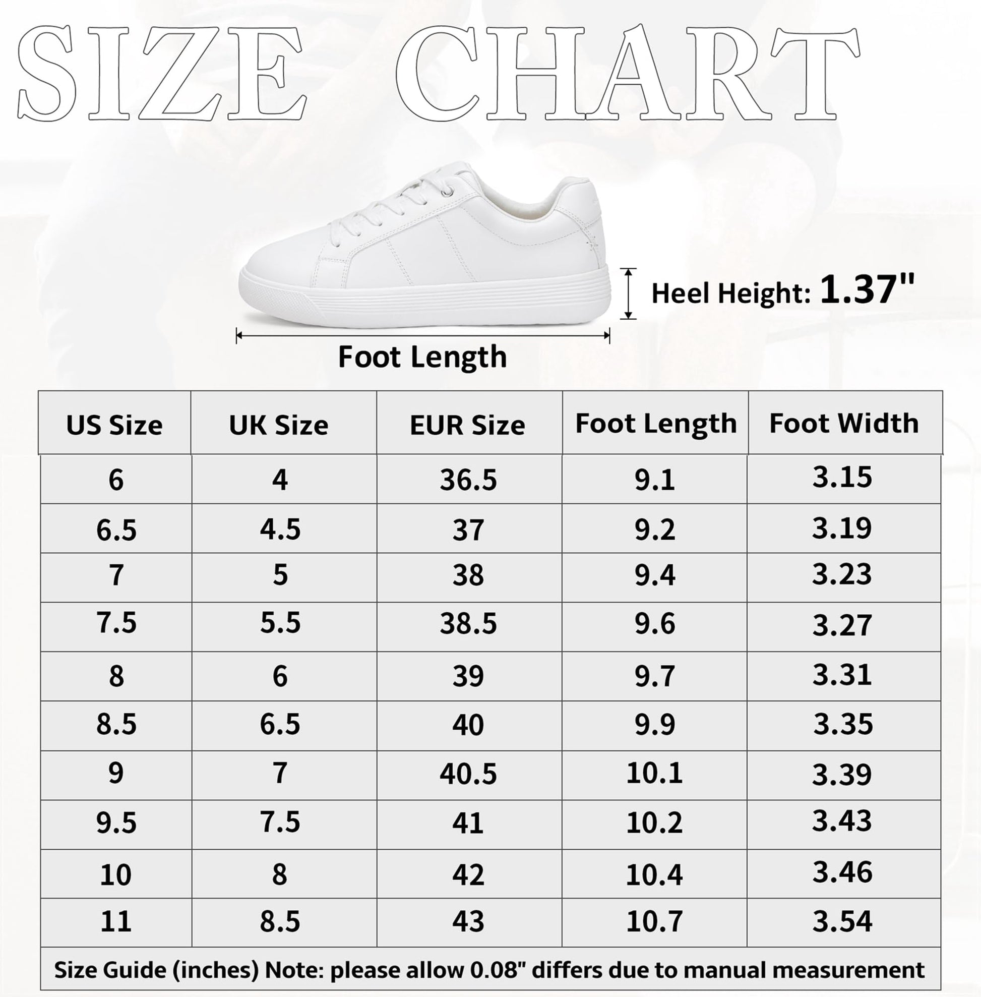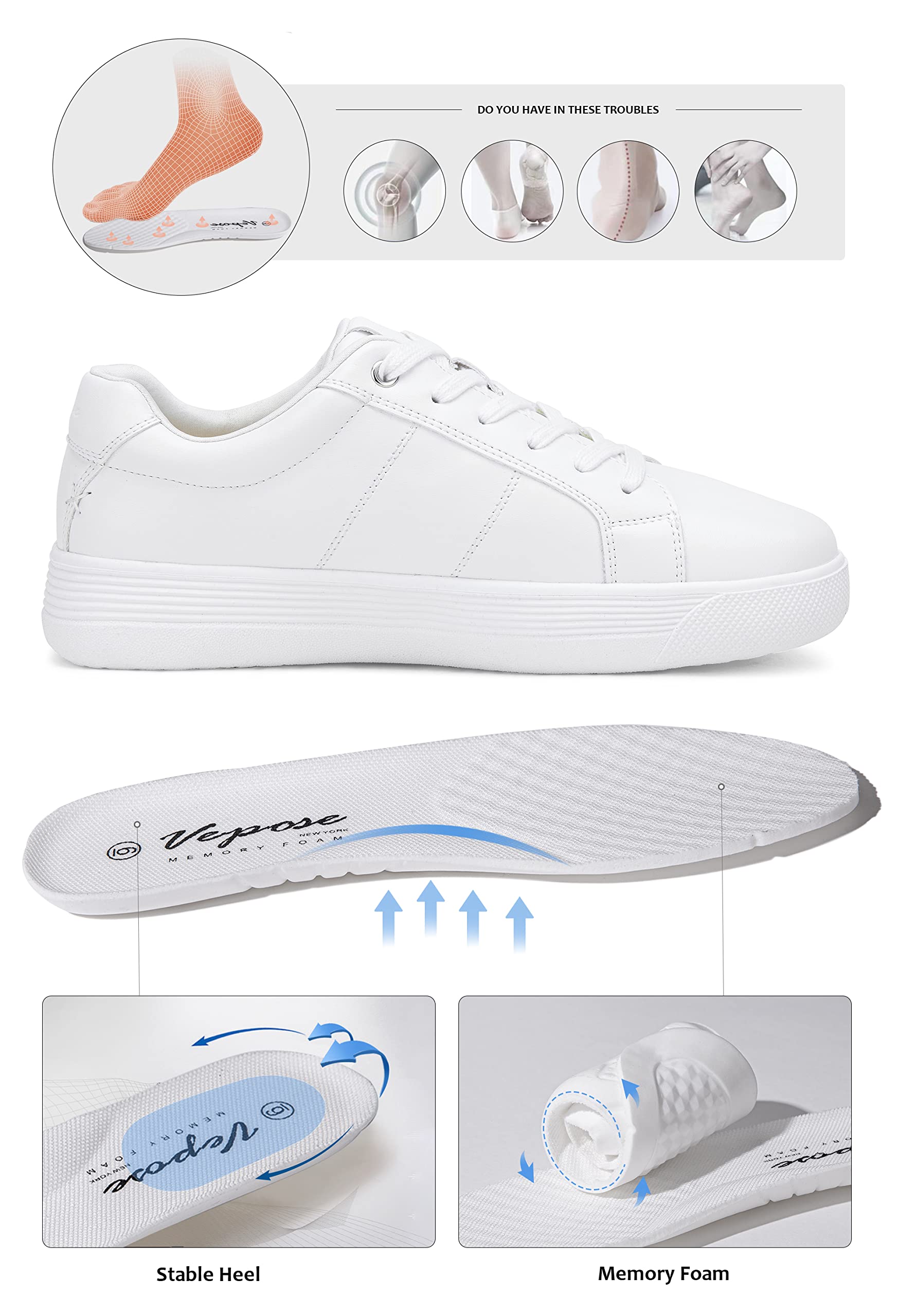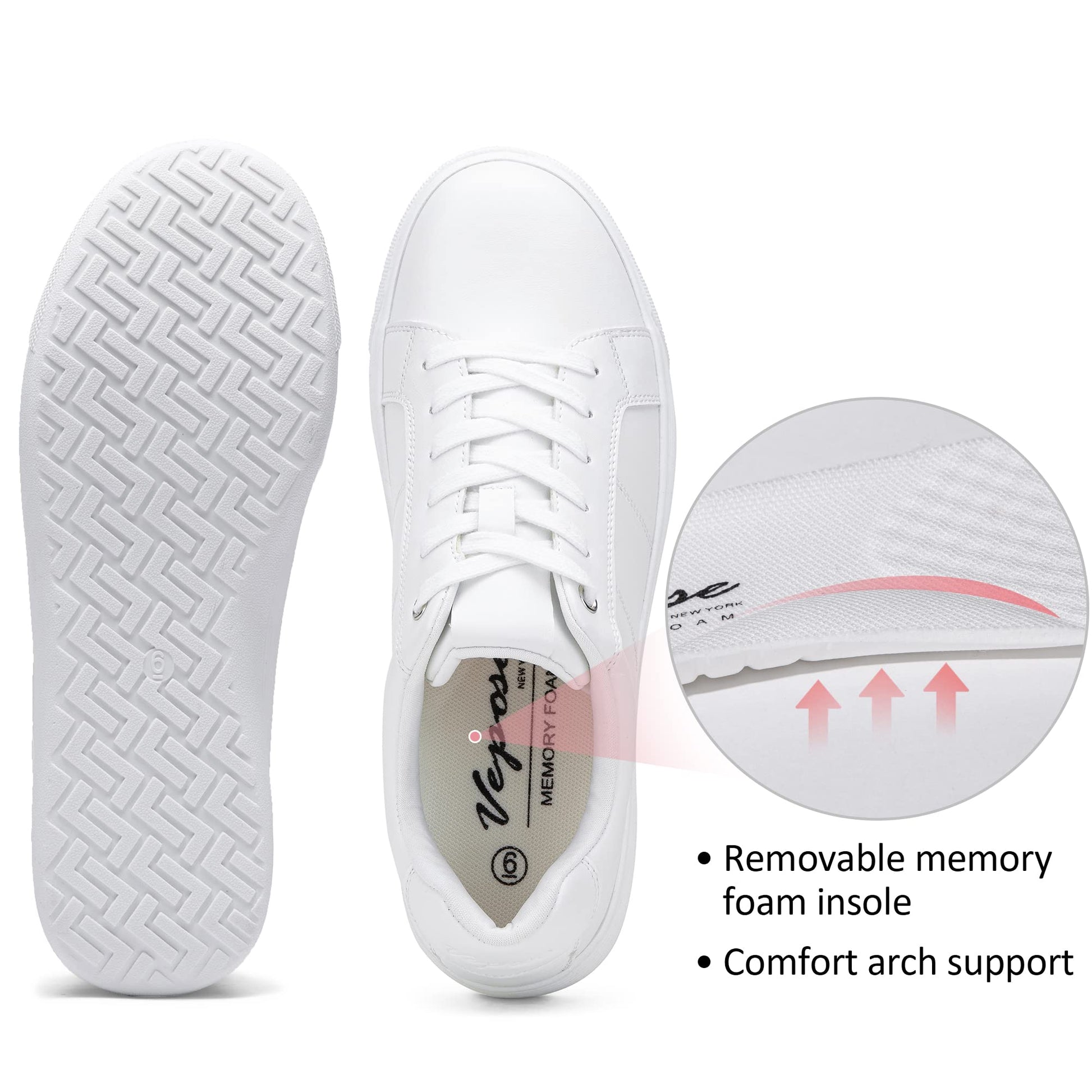 - Cushioned Foot Bed: These white sneakers feature cushioned footbed and padded insole that provide support and alleviate foot fatigue.
